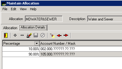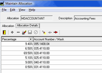 You can set up allocations on the Maintain Allocations screen. You will use the Allocation tab to maintain the identification information for each allocation, and the Allocation Details tab to maintain the percentage breakdowns that define how each allocation distributes expenditures or revenue.